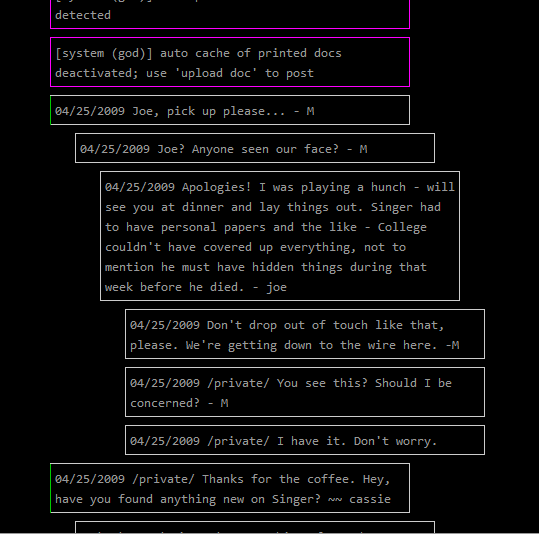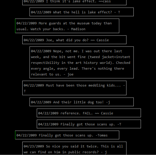 Through a back door in an otherwise secure intranet, you can observe the team's planning, read their conversations, even see private messages some members don't want others to read. Tracking the team's doings in town, you unlock the secret documents they've uncovered. Secrets are being kept. Tempers are starting to flare. A package the team doesn't think is theirs winds up in your hands and leads you to a forgotten copy of a diary - Margaret's diary.